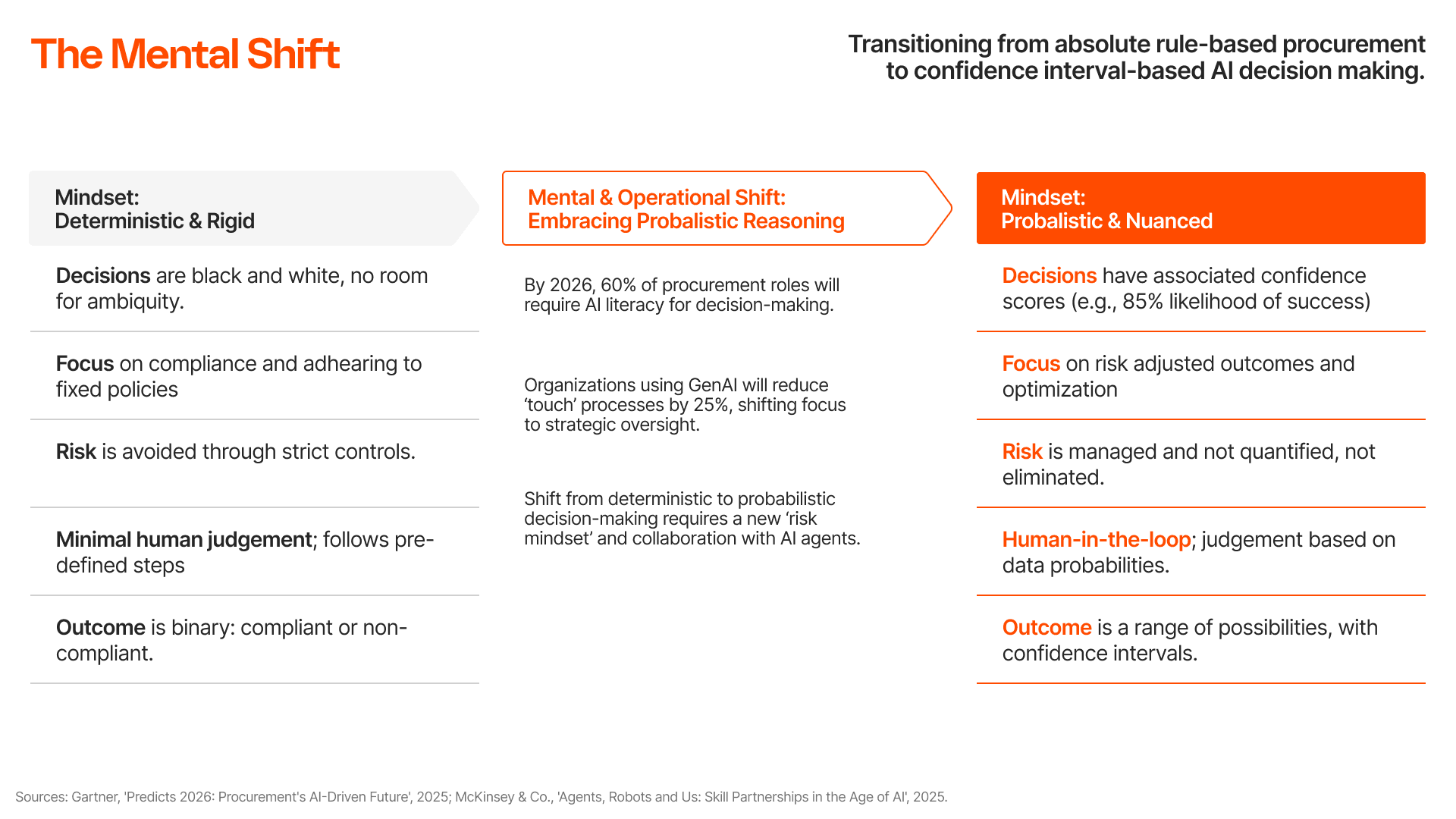 A complete AI roadmap needs to include a comprehensive transformation strategyAn effective AI roadmap must incorporate a holistic transformation strategy. Neglecting the organizational maturity, cultural readiness, and human support structures will render the most technically brilliant AI solution inert and unable to deliver business value. While many procurement functions have identified and begun to deploy AI use cases in Procurement, the real bottleneck is rarely the technology. It is the human transition into an integrated cognitive and agentic AI structure: one where cognitive AI provides prescriptive insights for better decision-making, and agentic AI executes multi-step tasks autonomously (with calibrated human-in-the-loop oversight).